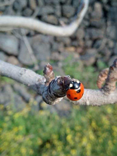 Una giornata di sole e mentre potiamo il pistacchio, le coccinelle iniziano ad affacciarsi nei notri terreni inerbiti, senza veleni.